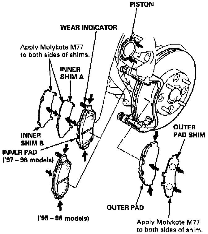 9. Apply Molykote M77 grease to both sides of the pad shims and to the back of the pads. Wipe excess grease off the shim.