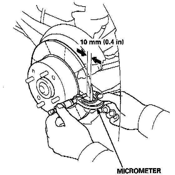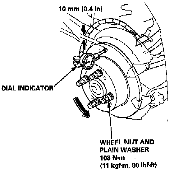 4. Use wheel nuts and suitable plain washers to hold the disc securely against the hub, then mount a dial indicator as shown and measure the runout at 0.10 mm (0.4 inch) from the outer edge of the disc.