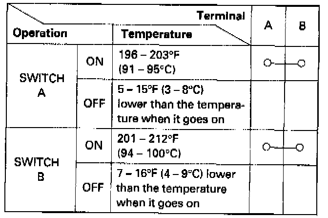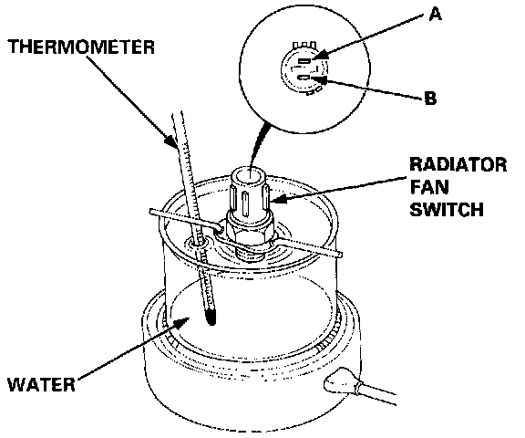 1. Remove the radiator fan switch A from the radiator and radiator fan switch B from the thermostat housing.