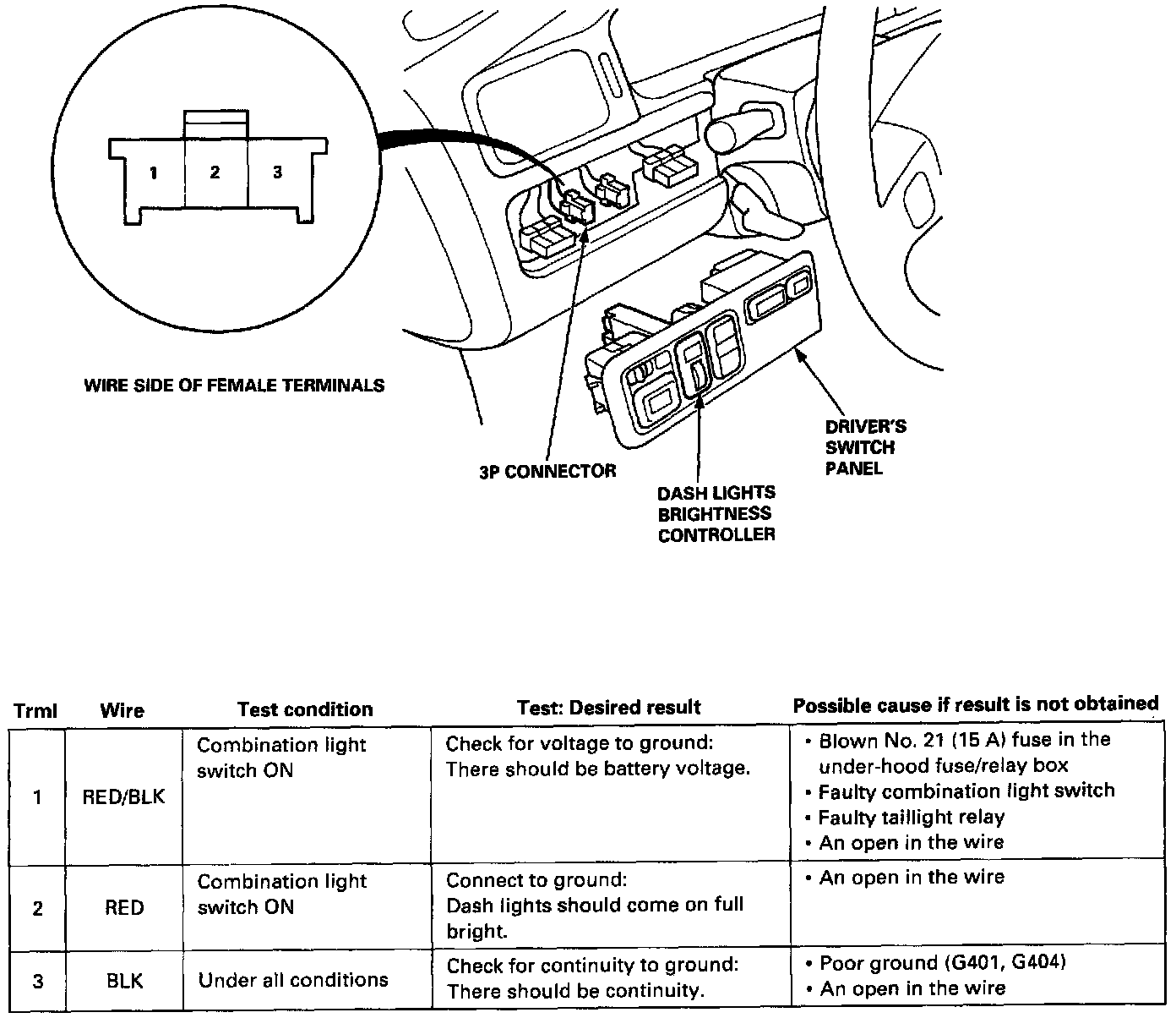 NOTE: The control unit is built into the dash lights brightness controller.1. Carefully pry the controller out of the dashboard, then disconnect the 3P connector from the controller.