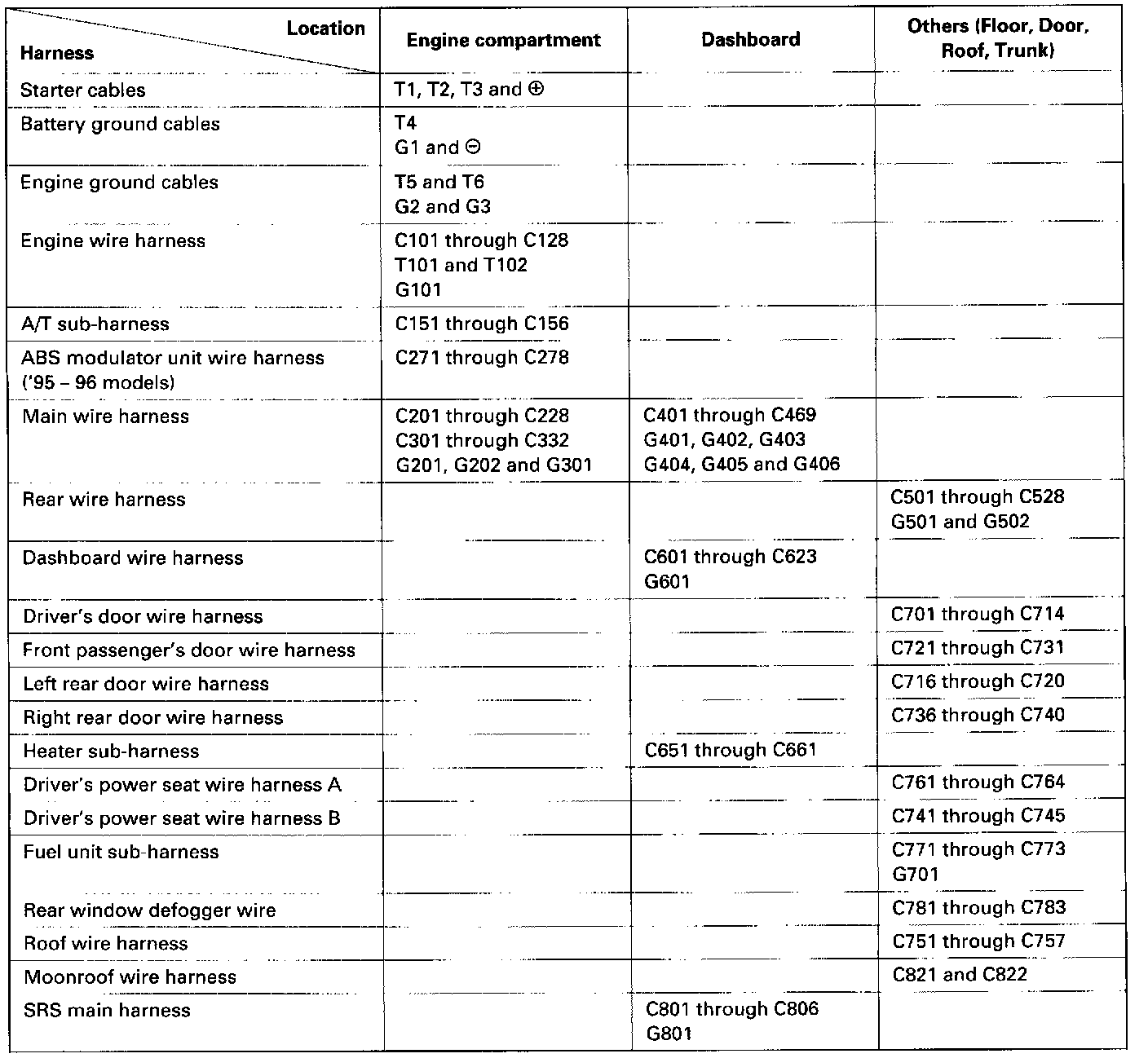 Identification numbers have been assigned to all connectors. The number is preceded by the letter "C,, for connectors, "G" for ground terminals or "T" for non-ground terminals.