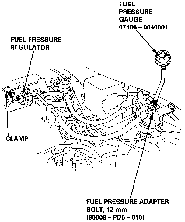 WARNING: Do not smoke during the test. Keep open flames away from your work area.1. Attach the special tool to the service port (models with service bolt) or the fuel pressure adapter bolt, 12 mm, (90008-PD6-010) (models without service bolt) on the fuel filter.