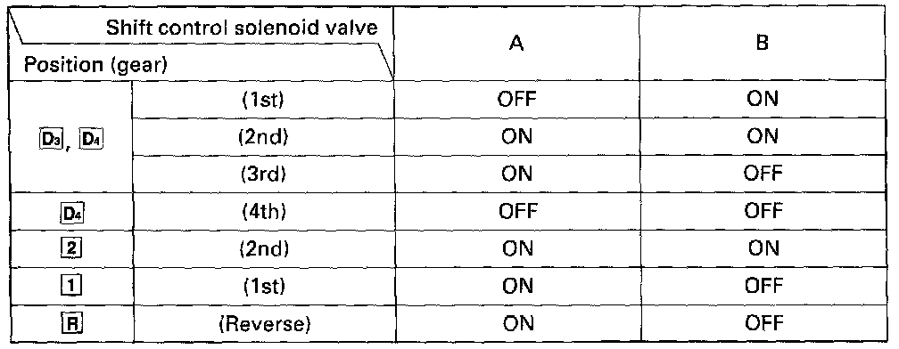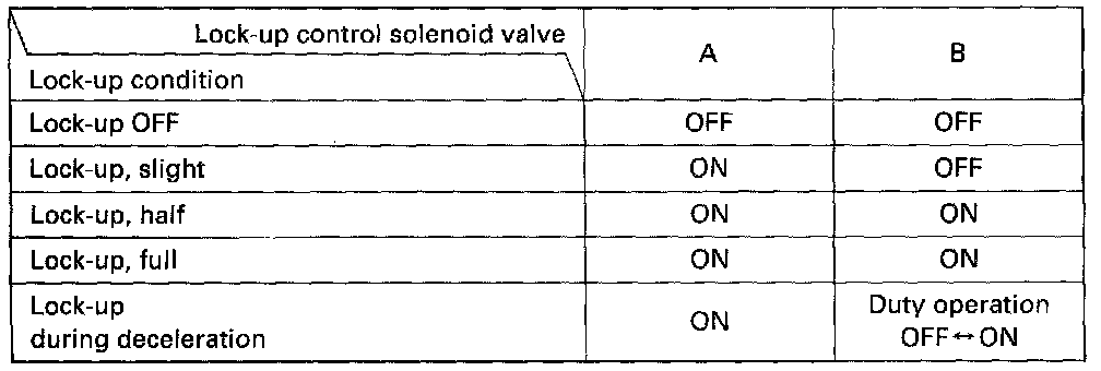 The combination of driving signals to lock-up control solenoid valves A and B is shown in the table below.