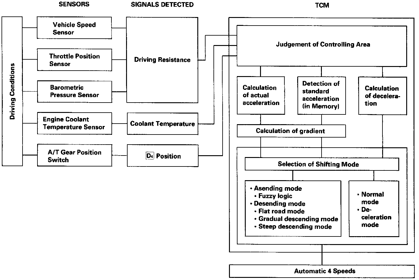 The TCM compares actual driving conditions with driving conditions memorized in the TCM, based on the input from the vehicle speed sensor, throttle position sensor, engine coolant temperature sensor, barometric pressure sensor, brake switch signal and shift lever position signal, to control shifting while a vehicle is ascending or descending a slope, or reducing speed.