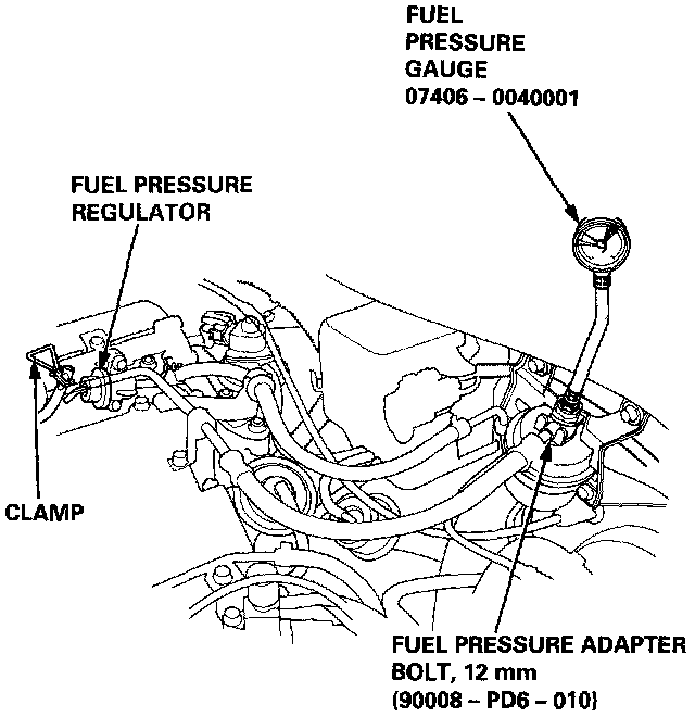 3. Start the engine. Measure the fuel pressure with the engine idling and the vacuum hose of the fuel pressure regulator disconnected from the fuel pressure regulator and pinched. If the engine will not start, turn the ignition switch ON (II), wait for two seconds, turn it off, then back on again and read the fuel pressure.