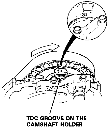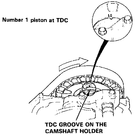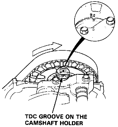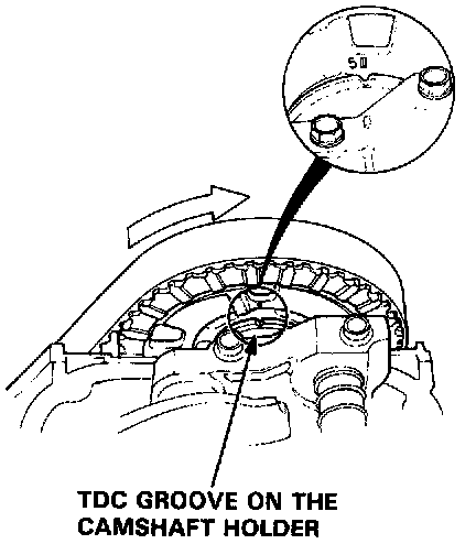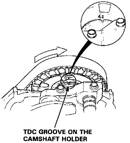 2. Align the No. 1 piston TDC mark with the TDC groove on the No. 1 camshaft holder as shown.