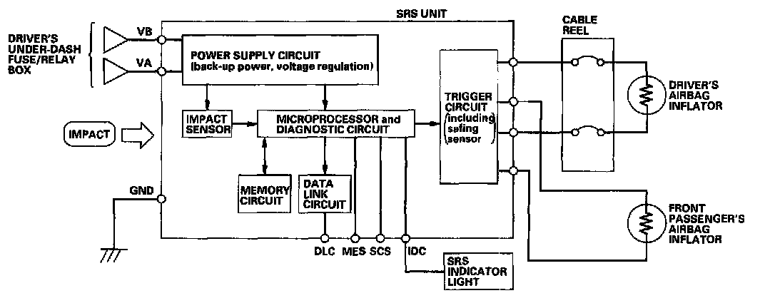 The main circuit in the SRS unit senses and judges the force of impact and, if necessary, ignites the inflator charges. If battery voltage is too low or power is disconnected due to impact, the voltage regulator and the back-up power circuit respectively will keep voltage at a constant level.