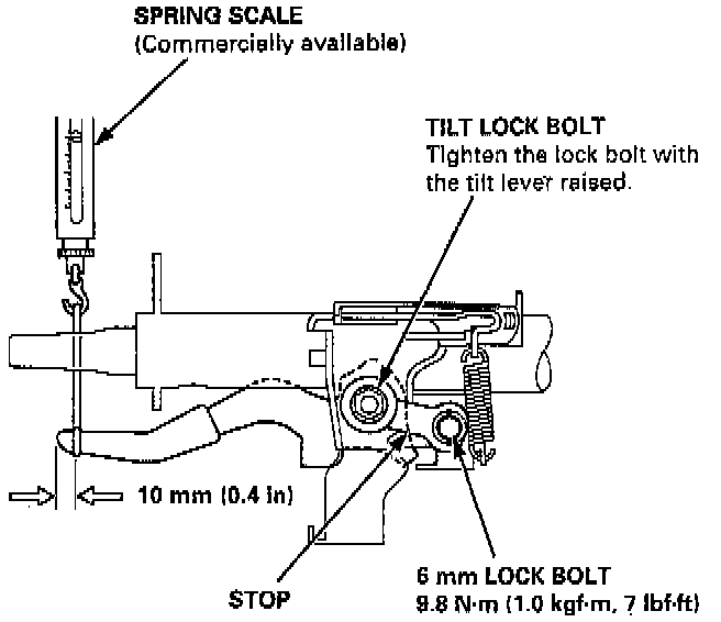 1. Move the tilt lever from the loose position to lock position 3 to 5 times; then measure the tilt lever preload 10 mm (0.4 inch) from the end of the tilt lever. Preload: 70 - 90 N (15 - 20 lbs.).