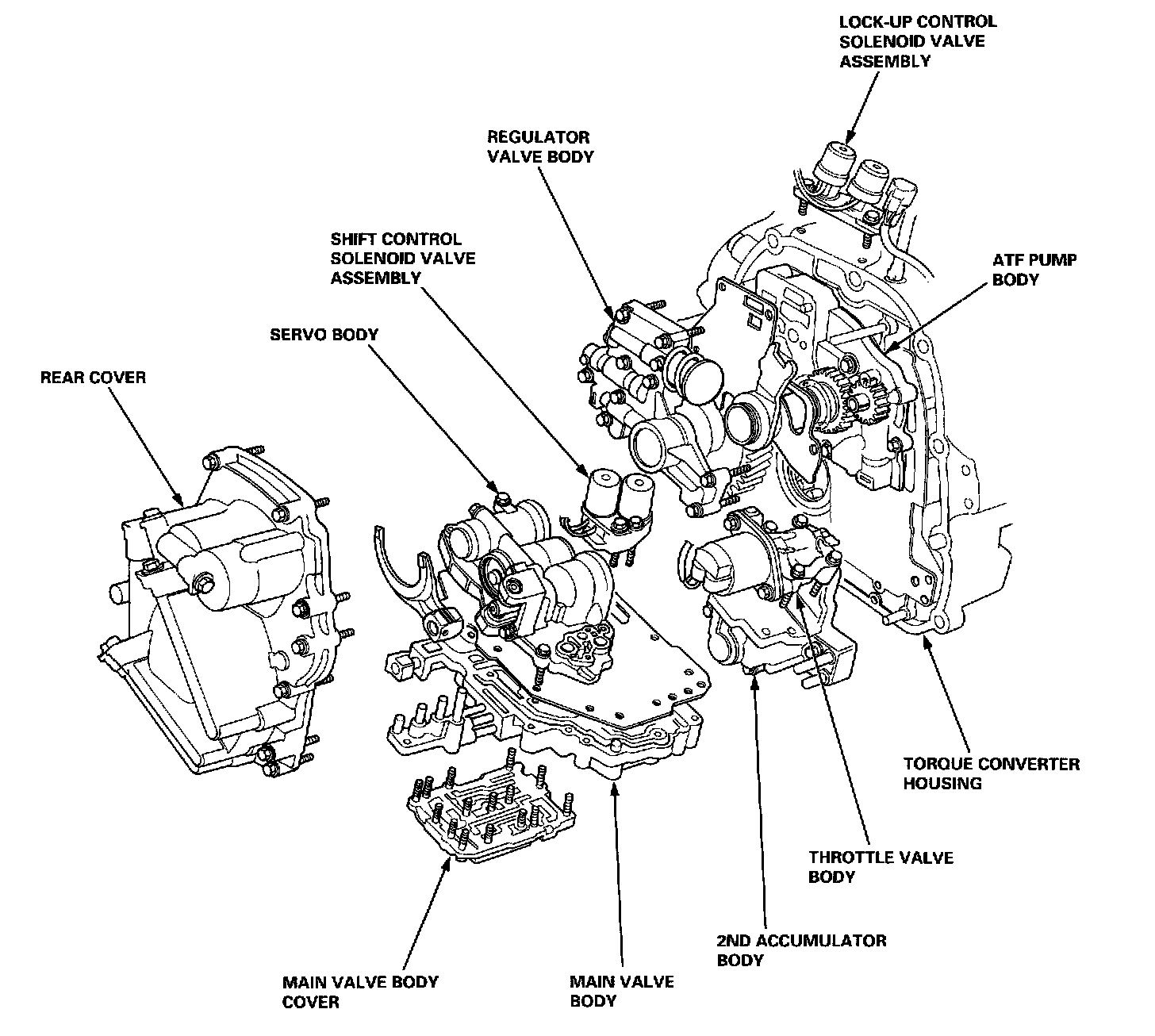 HYDRAULIC CONTROLThe hydraulic control system is controlled by the Automatic Transmission Fluid (ATF) pump, valves and accumulators in the valve bodies. The ATF pump is driven by splines on the end of the torque converter which is attached to the engine. Fluid from the ATF pump flows through the regulator valve to maintain specified pressure through the main valve body to the manual valve, directing pressure to each of the clutches. The valve body includes the main valve body, the servo body, the ATF pump body, the regulator valve body, the throttle valve body, and the 2nd accumulator body. The throttle valve body is joined with the linear solenoid. The throttle valve body/linear solenoid assembly is bolted on the 2nd accumulator body. The shift control solenoid valve assembly is bolted on the servo body. The lock-up control solenoid valve assembly is bolted on the outside of the torque converter housing.