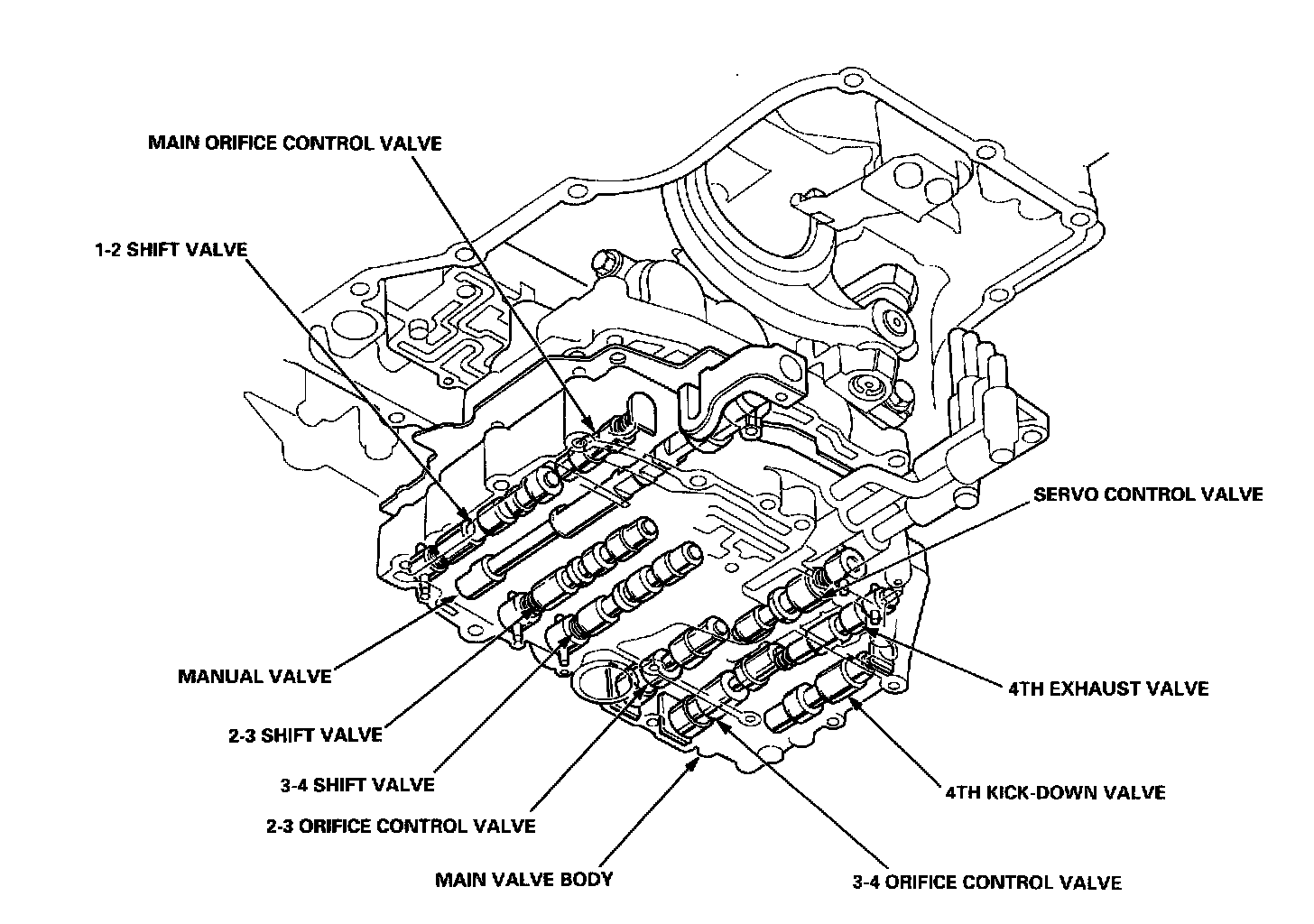 The main valve body houses the manual valve, the 1-2 shift valve, the 2-3 shift valve, the 3-4 shift valve, the main orifice control valve, the 2-3 orifice control valve, the 3-4 orifice control valve, the 4th kick-down valve, the 4th exhaust valve, and the servo control valve. The primary functions of the main valve body are to switch fluid pressure on and off and to control the hydraulic pressure going to the hydraulic control system.