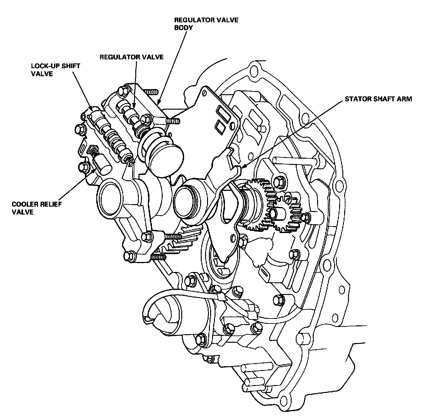 The regulator valve body is located on the Automatic Transmission Fluid (ATF) pump body. The regulator valve body consists of the regulator valve, the lock-up shift valve, and the cooler relief valve.