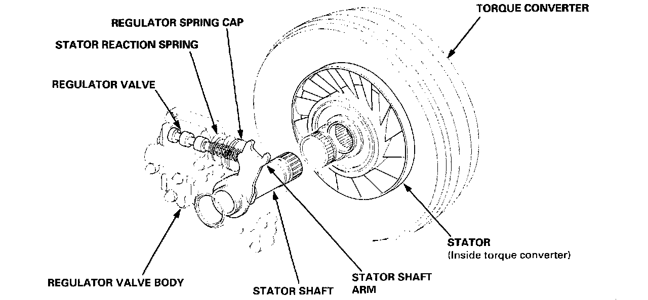 Hydraulic pressure increases according to the torque is performed by the regulator valve using the Stator torque reaction. The stator shaft is splined with the stator in the torque converter, and its arm end contacts the regulator spring cap. When the vehicle is accelerating or climbing (Torque Converter Range), the stator torque reaction acts on the stator shaft, and the stator arm pushes the regulator spring cap in the - direction in proportion to the reaction. The stator reaction spring compresses, and the regulator valve moves to increase the line pressure which is regulated by the regulator valve. The line pressure reaches its maximum when the stator torque reaction reaches its maximum.