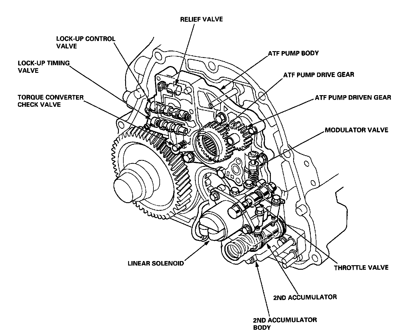 The Automatic Transmission Fluid (ATF) pump body is located on the torque converter housing. The ATF pump body consists of the ATF pump gears, the lock-up control valve, the lock-up timing valve, the relief valve and the modulator valve. The torque converter check valve is located between the ATF pump body and the torque converter housing.