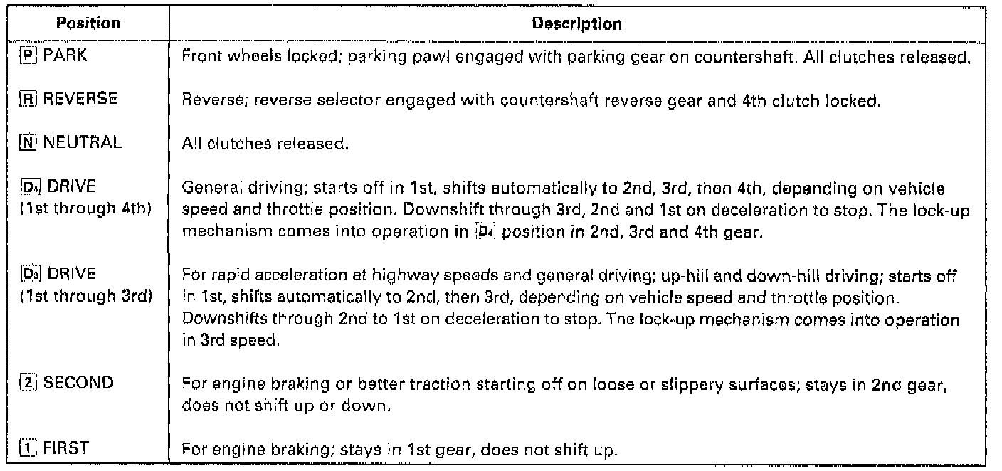 The shift lever has seven positions: P PARK, R REVERSE, N NEUTRAL; D4 1st through 4th gear ranges, D4 1st through 3rd gear ranges, 2 2nd gear and 1 1st gear.