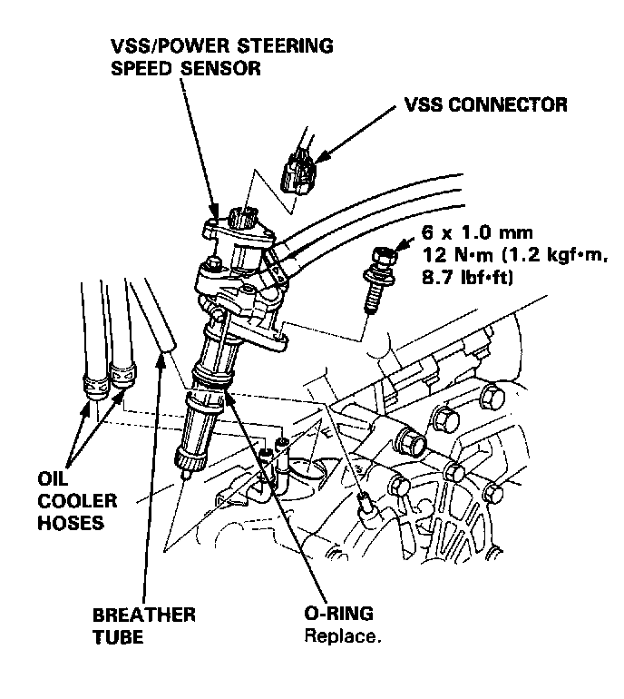 4. Install the Vehicle Speed Sensor (VSS)/power steering speed sensor, then connect the oil cooler hoses and the breather tube.