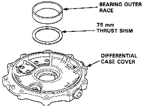 3. Remove the bearing outer race and the 75 mm thrust shim from the differential case cover by driving them out or by heating the differential case cover to about 212°F (100°C).