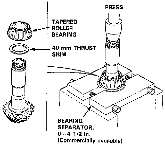 12. Remove the tapered roller bearing and 40 mm thrust shim using a press as shown.