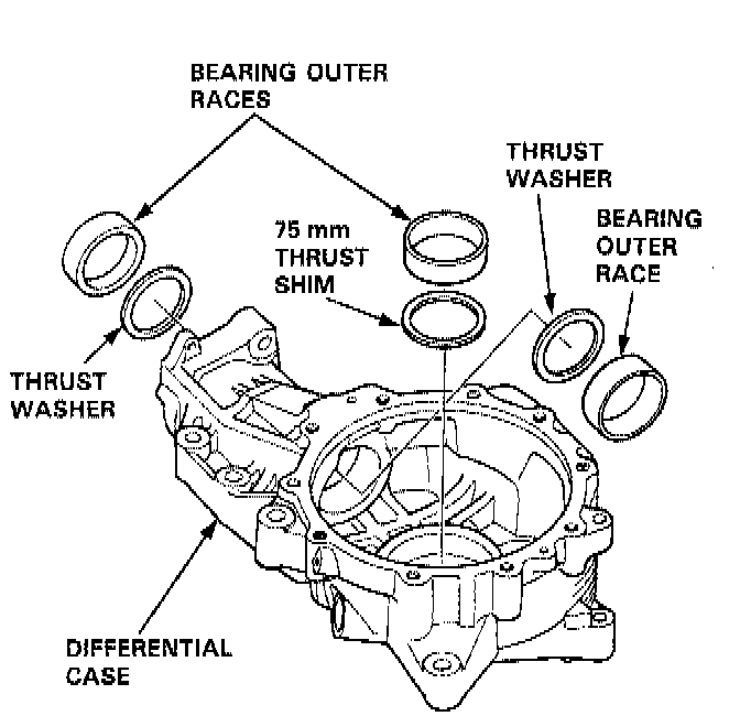 13. Remove the bearing outer races, 75 mm thrust shim, and thrust washers by driving them out from behind using the grooves provided or by heating the differential case to about 212°F (100°C).
