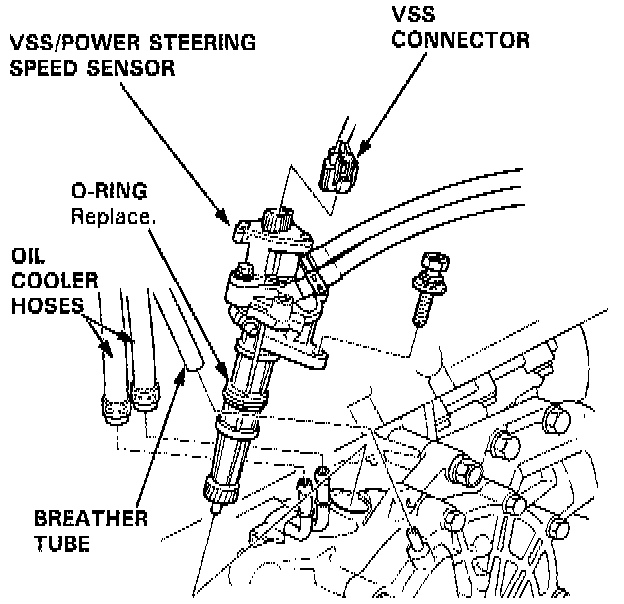 12. Disconnect the oil cooler hoses, breather tube and VSS connector, then remove the vehicle speed sensor (VSS)/power steering speed sensor.