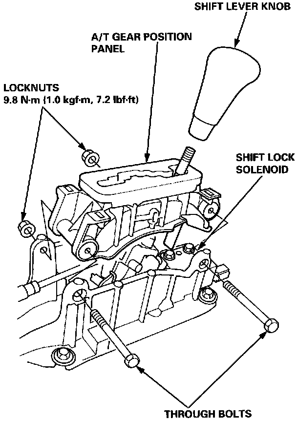 3. Remove the two locknuts and through bolts, then remove the A/T gear position panel.