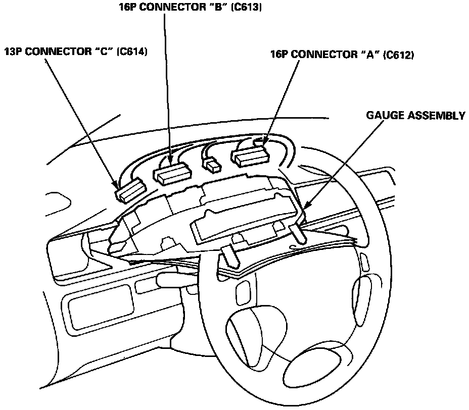 SRS components are located in this area. Review the SRS component locations, precautions, and procedures in the SRS section before performing repairs or service.1. Remove the gauge assembly from the dashboard, and disconnect the 16P connectors (C612, C613), and 13P connector (C614) from the gauge assembly.