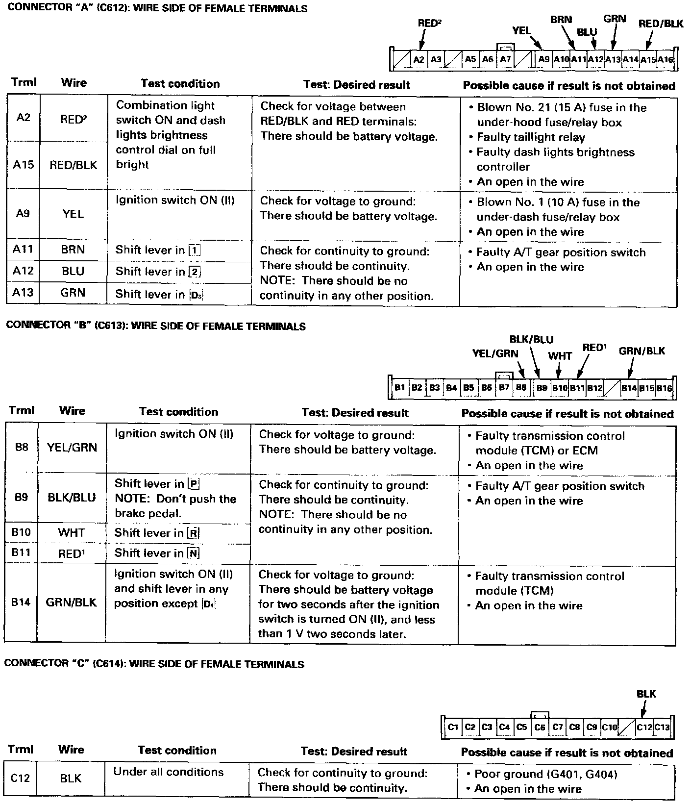 ^ If the terminals look OK, make the following input tests at the 16P (C612, C613) and 13P (C614) connectors.