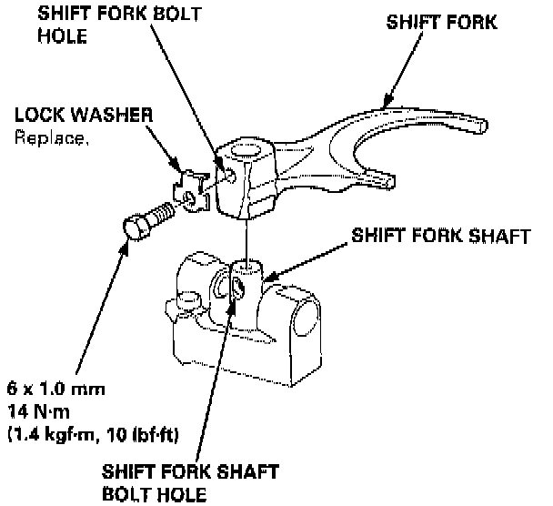2. Install the shift fork and the lock bolt with a new lock washer, and torque the bolt.