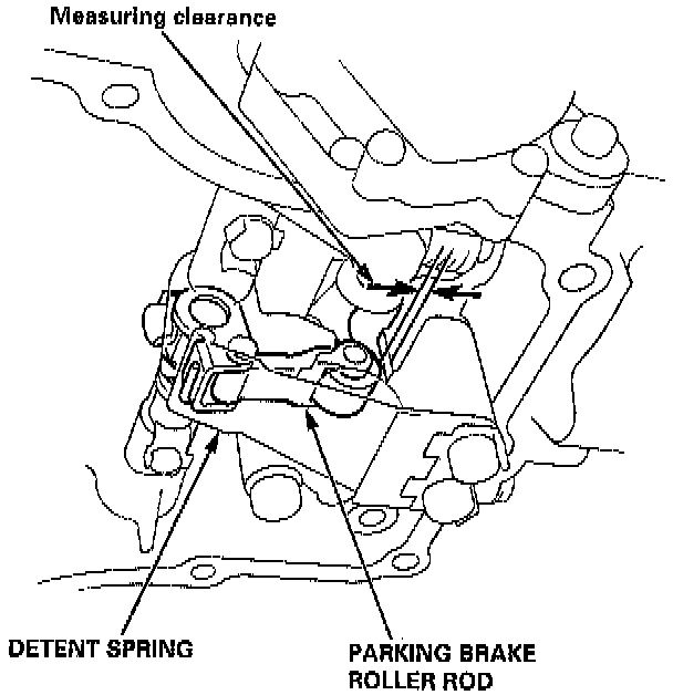 2. Measure the clearance between the transmission housing and the tip of the parking brake roller rod as shown.