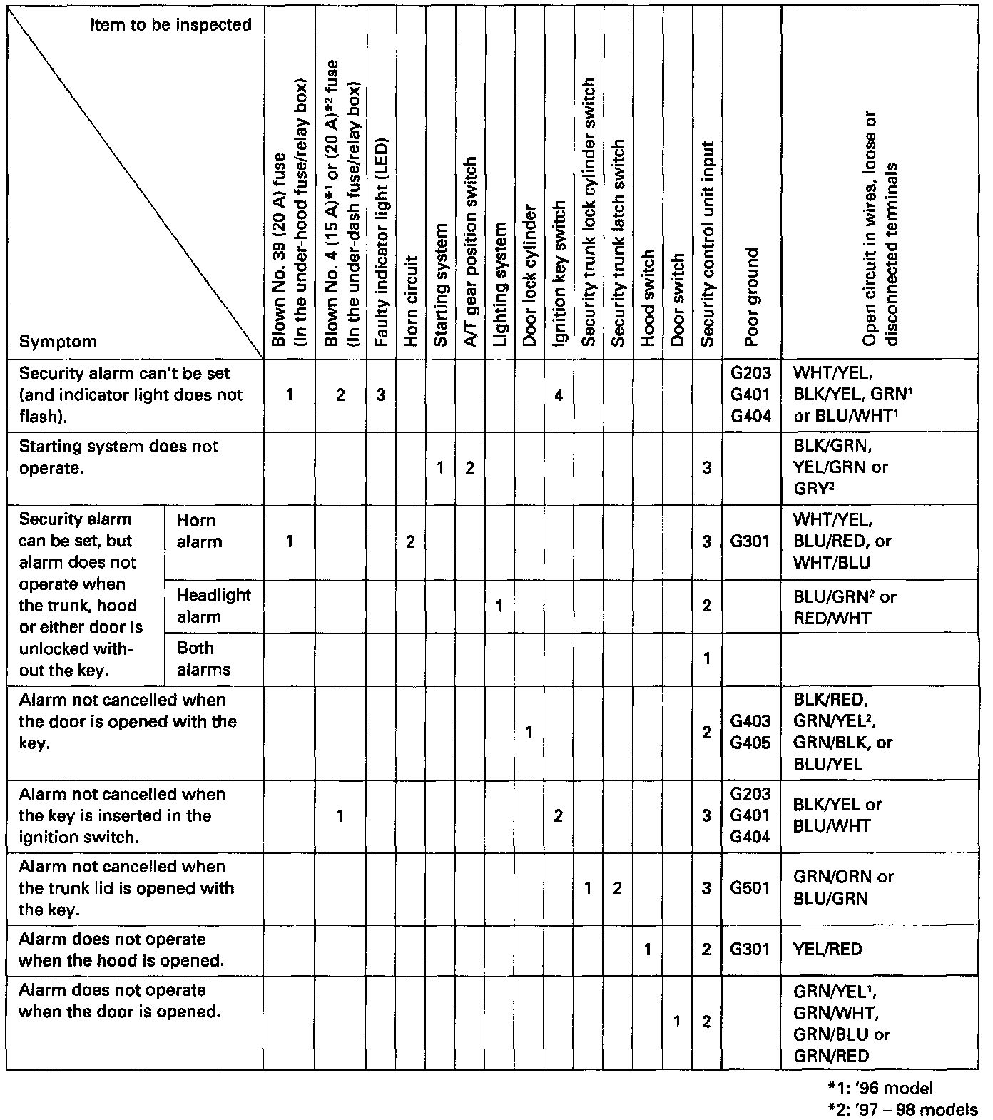 The numbers in the table show the troubleshooting sequence.