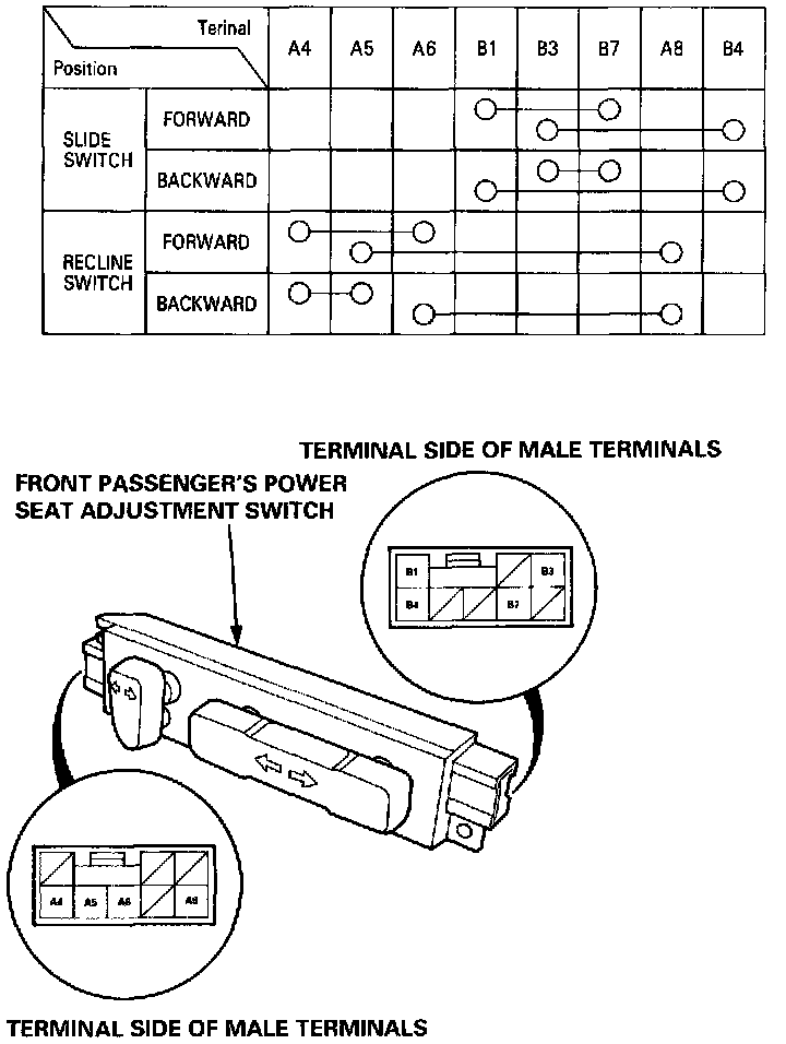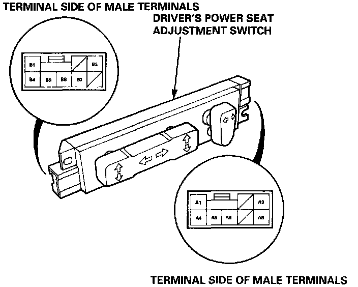 NOTE: The illustration shows the driver's power seat adjustment switch; the front passenger's power seat adjustment switch is symmetrical.