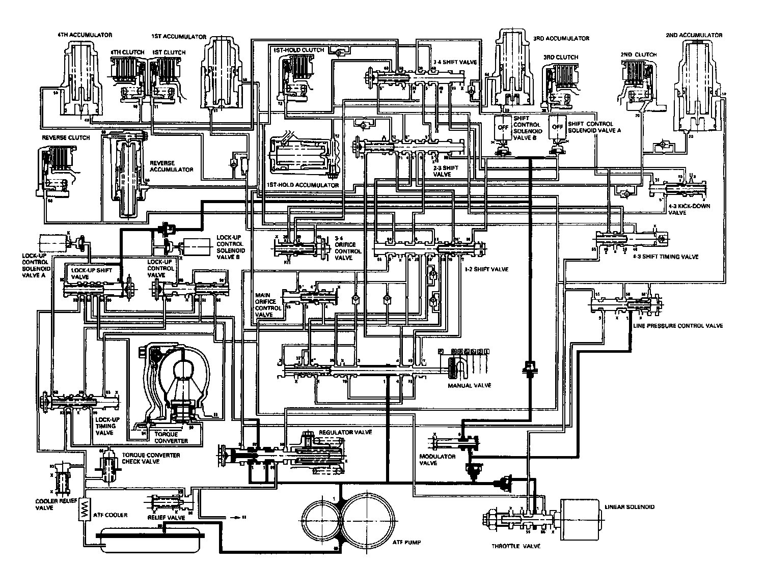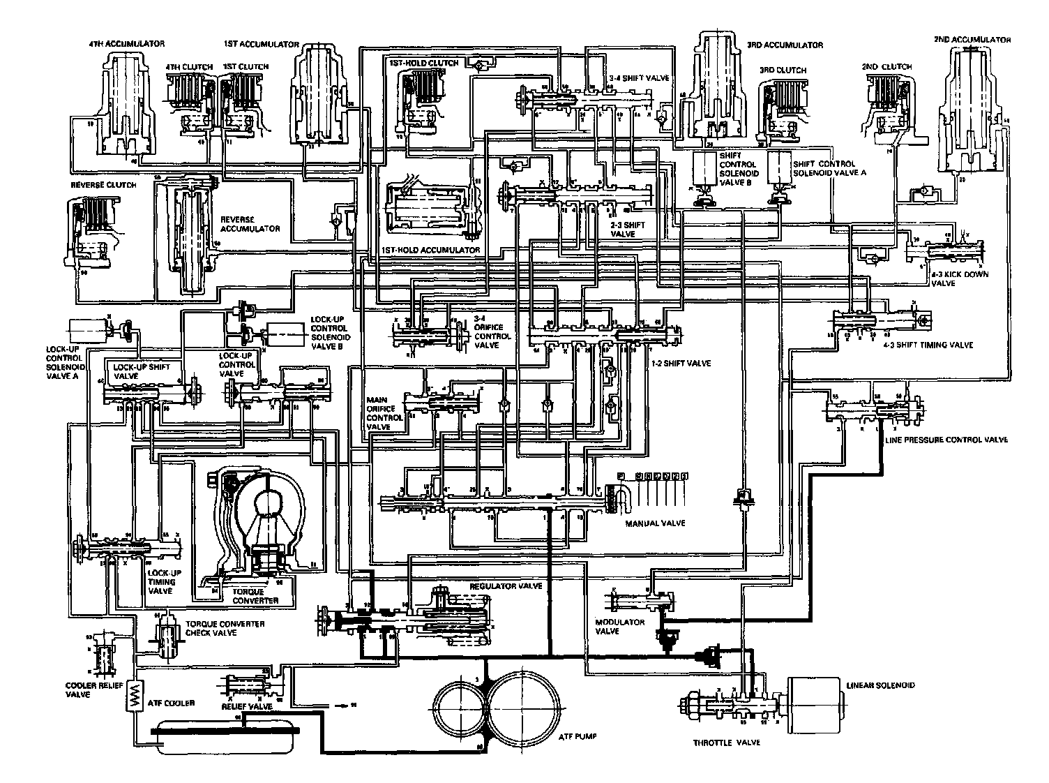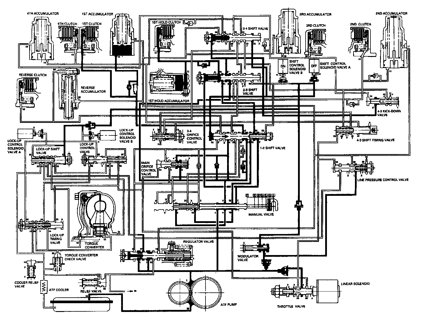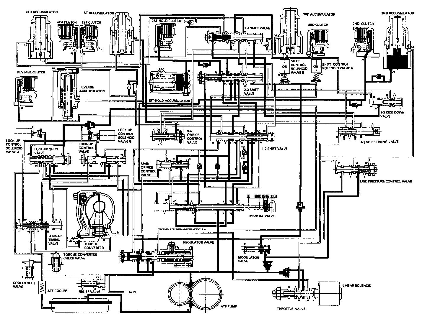 As the engine turns, the ATF pump also starts to operate. Automatic transmission fluid (ATF) is drawn from (99) and discharged into (1). Then, ATF flowing from the ATF pump becomes line pressure (1). Line pressure (1) is regulated by the regulator valve. The torque converter inlet pressure (92) enters (94) of the torque converter through the lock-up shift valve and discharges into (90). The torque converter check valve prevents torque converter pressure from rising. Under this condition, hydraulic pressure is not applied to the clutches as the manual valve stops line pressure (1).