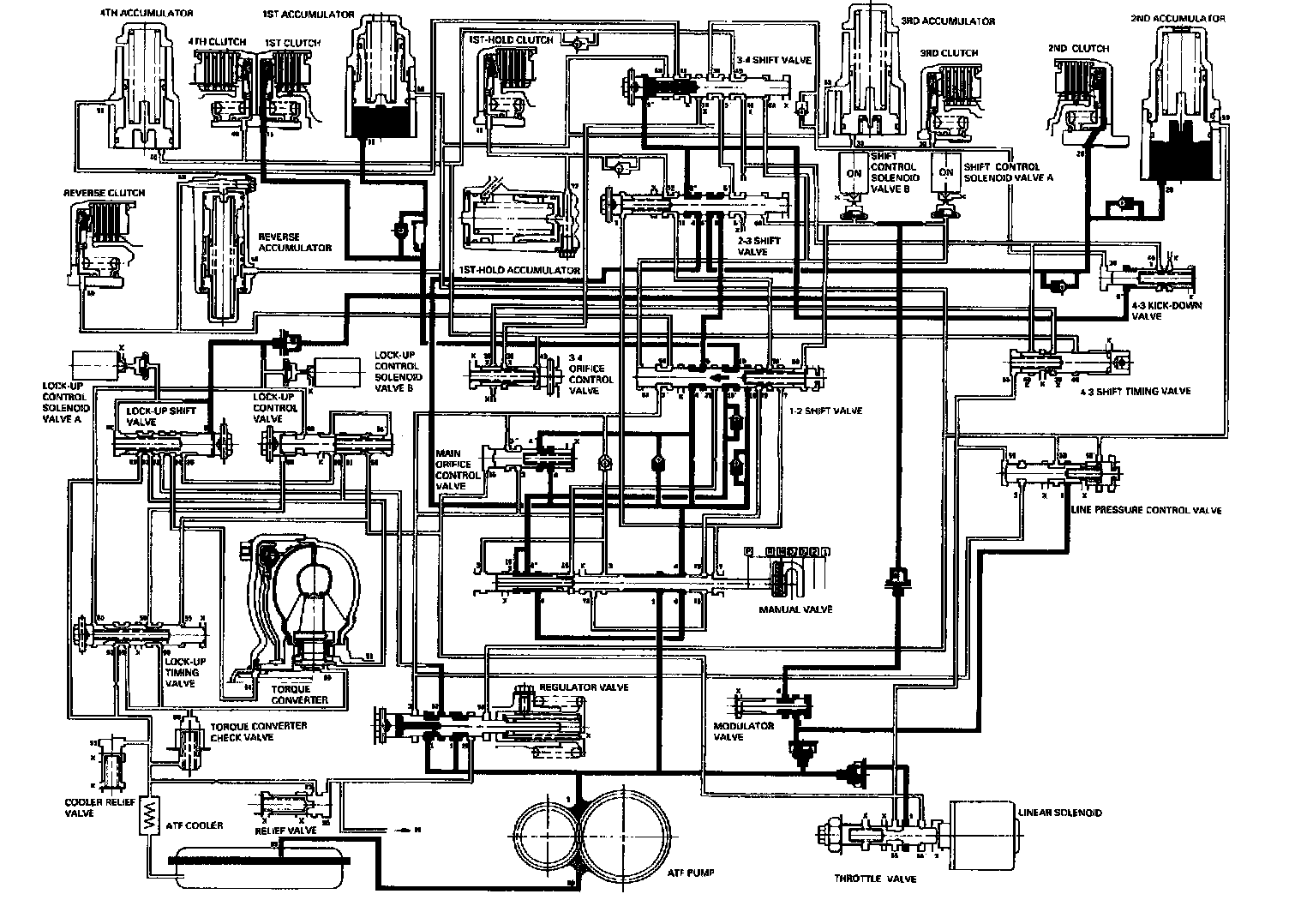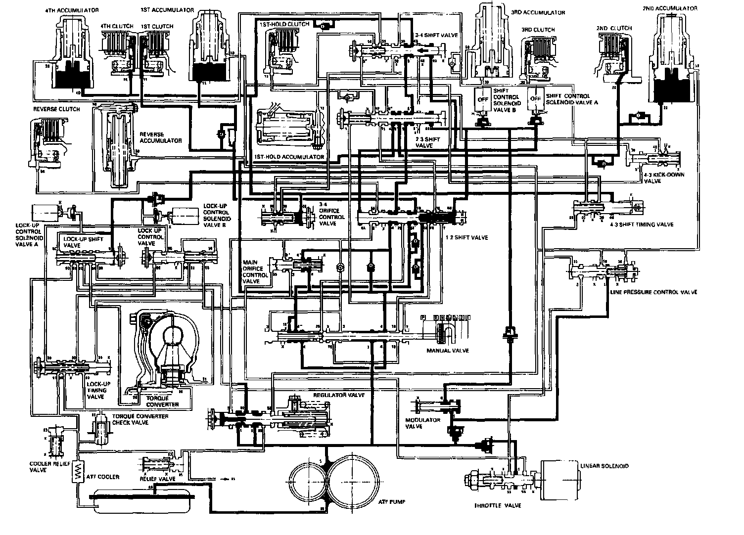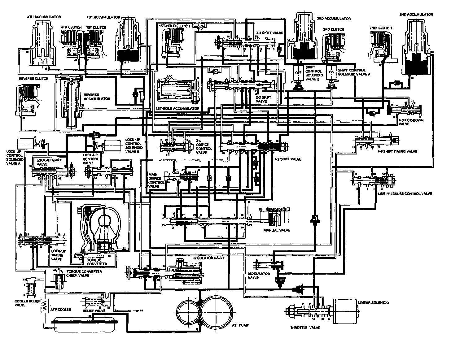 Line pressure (1) flows to the manual valve, the modulator valve, the line pressure control valve, and the throttle valve. Line pressure (1) becomes modulator pressure (6) at the modulator valve, line pressure (4) and (7), and 1st-hold clutch pressure (70) at the manual valve. Modulator pressure (6) flows to the 1-2 shift valve, the 2-3 shift valve and the 3-4 shift valve because the shift control solenoid valve A is turned OFF and B is turned ON by the PCM, and the 1-2 shift valve is moved to the right side. Line pressure (4) becomes 1st clutch pressure (10) at the 1-2 shift valve. The 1st clutch pressure (10) is applied to the 1st clutch, and the 1st clutch is engaged. Line pressure (7) becomes 1st-hold clutch pressure (70) at the 1-2 shift valve. The 1st-hold clutch pressure (70) is applied to the 1st-hold clutch, and the 1st-hold clutch is engaged.