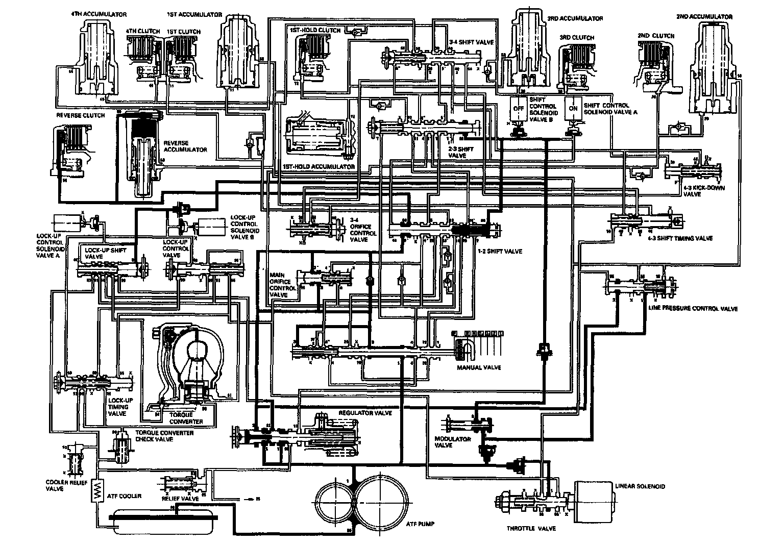 As the speed of the vehicle reaches the prescribed value, shift control solenoid valve A is turned OFF by means of the PCM. Shift control solenoid valve B remains OFF. Modulator pressure (6A) flows to the right end of the 3-4 shift valve and the left end of the 1-2 shift valve. Modulator pressure (6A) in the left end of the 1-2 shift valve equals modulator pressure (6B) in the right end of the 1-2 shift valve, so the 1-2 shift valve remains in the left side by the tension of the valve spring. The 3-4 shift valve is moved to the left side by modulator pressure (613). The 3-4 shift valve covers the port leading to the 3rd clutch and uncovers to the 4th clutch as this valve is moved to the left side. Line pressure (5') from the 2-3 shift valve becomes 4th clutch pressure (40) at the 3-4 shift valve. The 4th clutch pressure (40) is applied to the 4th clutch, and the 4th clutch is engaged.
