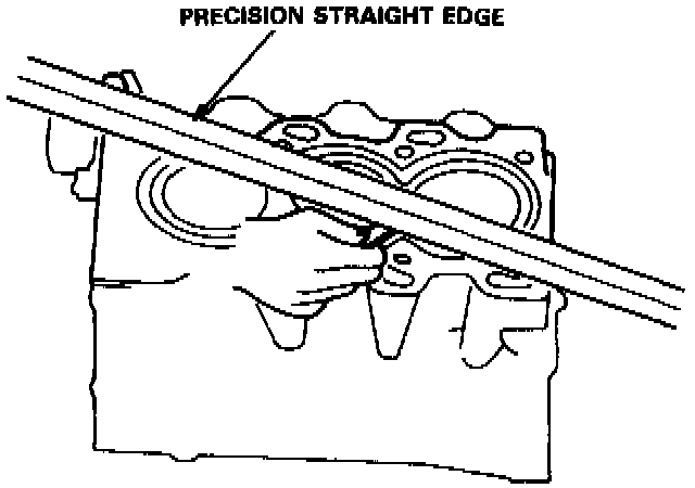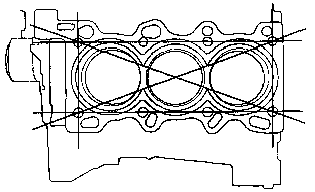 2. Check the top of the cylinder block for warpage. Measure along the edges and across the center as shown.