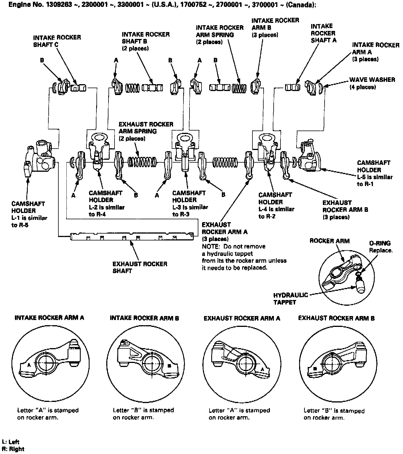 - When removing or installing the rocker arm assembly, do not remove the camshaft holder bolts. The bolts will keep the holders, springs and rocker arms on the shaft.