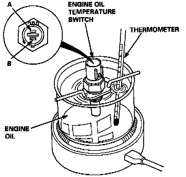 1. Remove the engine oil temperature switch from the right cylinder head cover.2. Suspend the engine oil temperature switch in a container of engine oil as shown.