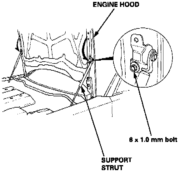 2. Remove the support struts from the engine hood, and fix the engine hood in a vertical position, then reinstall the support struts by using 6 x 1.0 mm bolts.