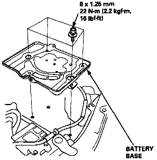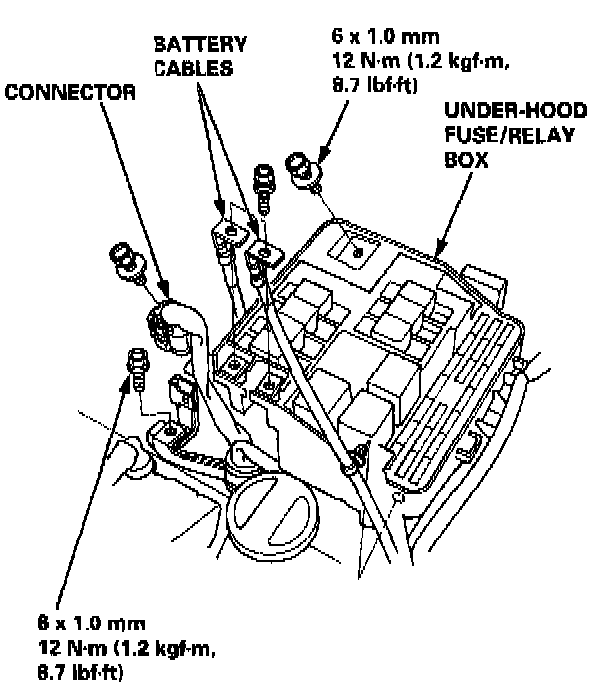 13. Remove the battery cables from the under hood fuse/relay box, then remove the under-hood fuse/relay box.