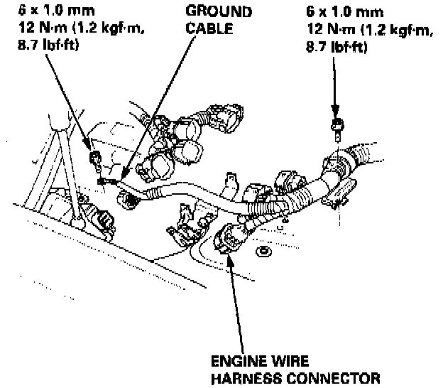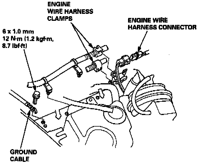 11. Remove the engine ground cable and engine wire harness clamps.