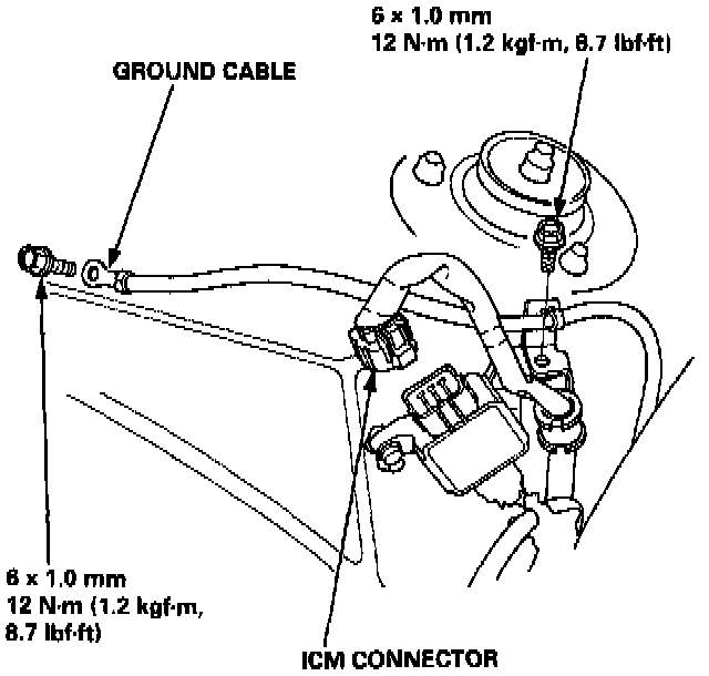 16. Disconnect the Ignition Control Module (ICM) connector and remove the engine ground cable.