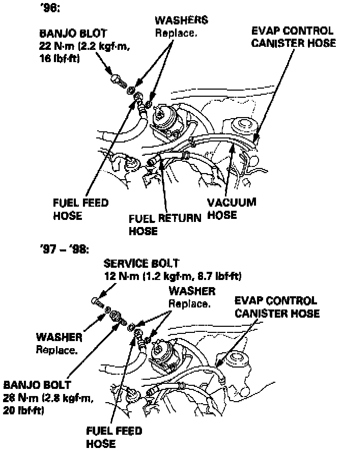 23. Remove the fuel feed hose, fuel return hose, vacuum hose and Evaporative Emission (EVAP) control canister hose.