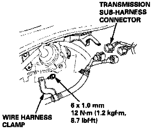 24. Disconnect the transmission sub-harness connector, and remove the wire harness clamp.