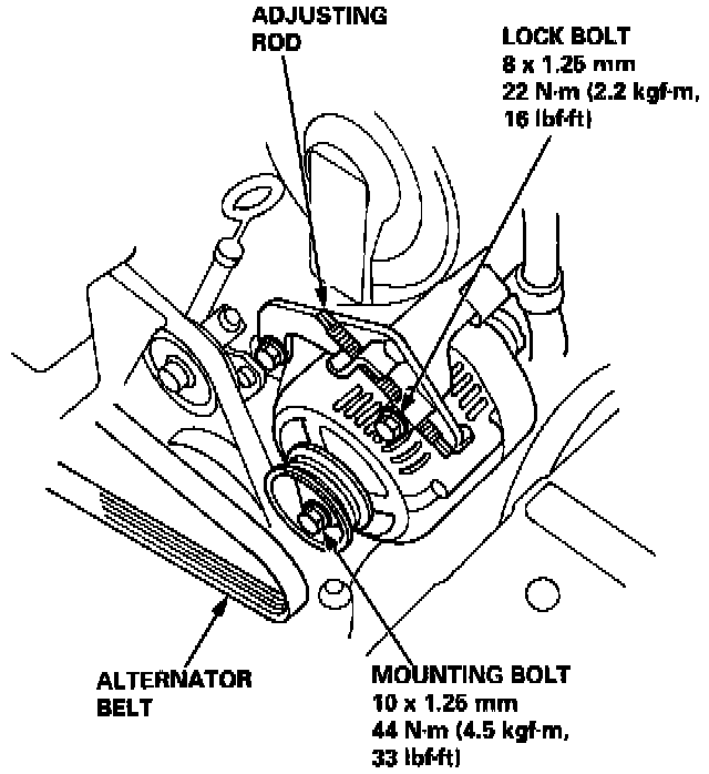 25. Loosen the mounting bolt, lock bolt and adjusting rod, then remove the alternator belt.