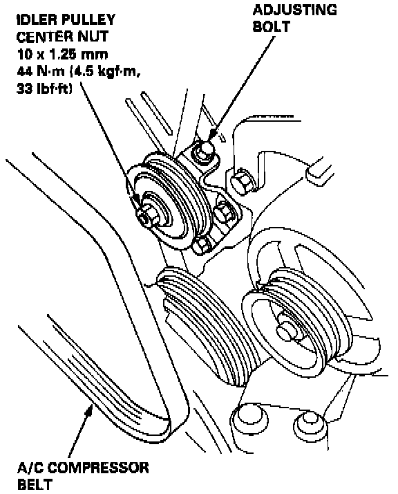 26. Loosen the idler pulley center nut and adjusting bolt, then remove the Air Conditioning (A/C) compressor belt.