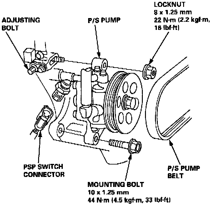 28. Remove the adjusting bolt, locknut and mounting bolt, then remove the P/S pump belt and pump.