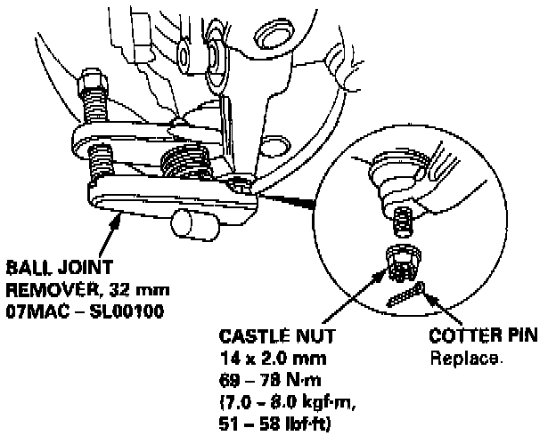 38. Disconnect the suspension lower arm ball joints with the special tool. Refer to section 18 for the proper procedure.