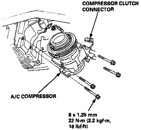 40. Disconnect the compressor clutch connector, then remove the A/C compressor.