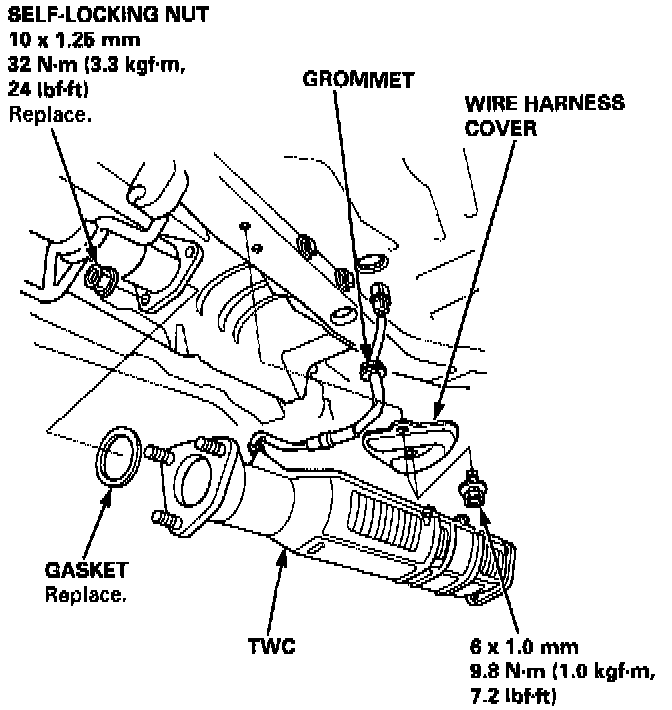 44. Remove the wire harness cover and grommet, then remove the Three Way Catalytic Converter (TWC).
