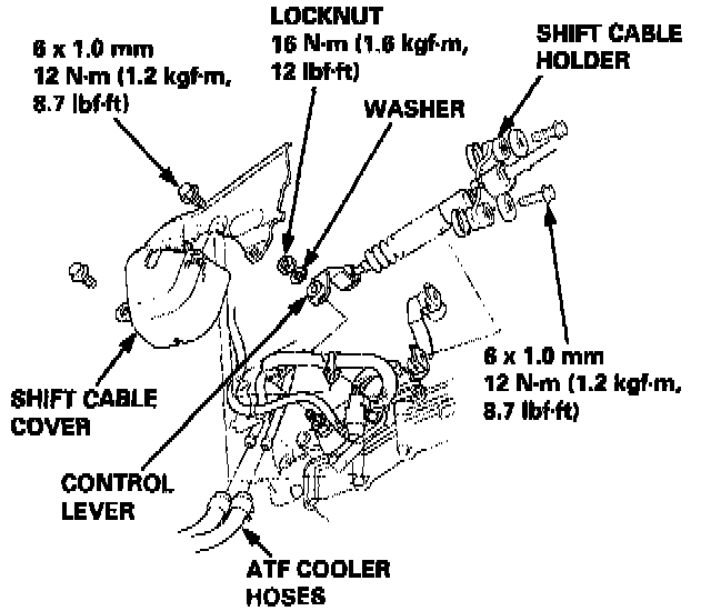 47. Remove the shift cable cover mounting bolts, then remove the A/T gear position switch harness clamp and the shift control solenoid valve/linear solenoid harness connector from the shin cable cover.