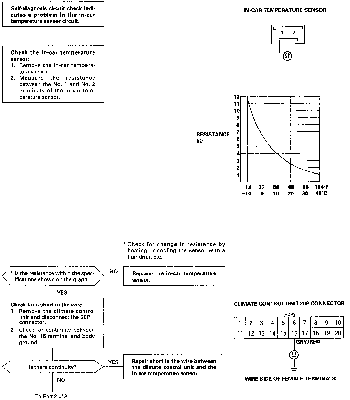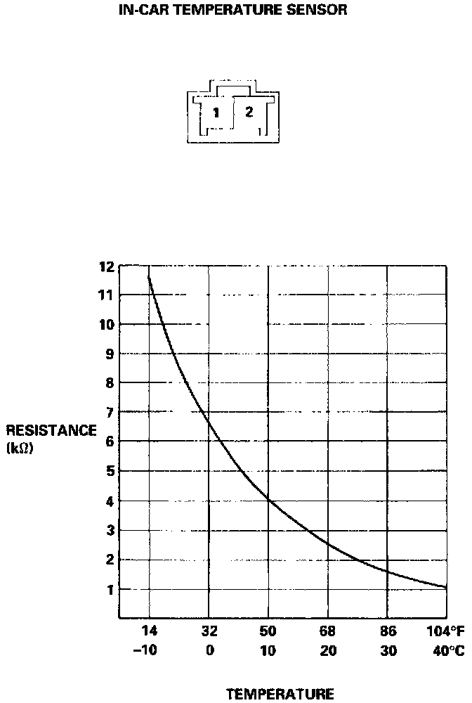 Compare the resistance reading between the No. 1 and No. 2 terminals of the in-car temperature sensor with the specifications shown in following graph; resistance should be within specifications.